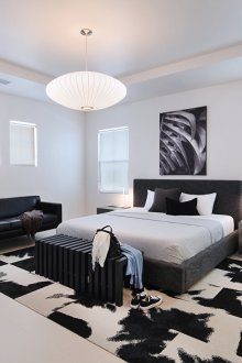 Подредбата на мебелите в спалнята в монохромен дизайн