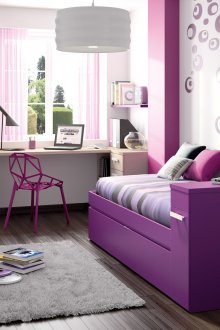 Дизайнът на стая за момиче традиционно е обичайно да се изпълнява в бледо розово. Някои производители на мебели поддържат тази тенденция и произвеждат розови мека мебел, които също често са украсени с рюшами, извивки, бродерии, кристали и възглавници за сърце. На такова легло бебето ще се чувства като истинска принцеса. Приказен балдахин ще ви помогне да създадете балдахин. За цветен балдахин детето не само ще спи удобно, но и ще се забавлява да играе.
